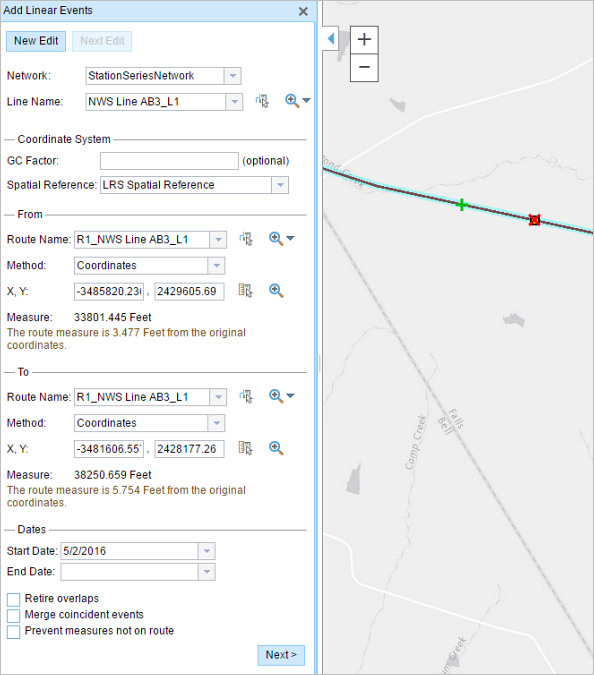 Characteristics of a route such as speed limit or functional class can be represented as a linear event with starting and ending measure information along the route. The Line Events tool provides an interface to add linear events by typing or selecting their x- and y-coordinates. You can also use reference offset data to add events to a route. The reference offset data is translated to routes and measures for storage.